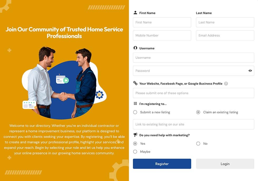 Welcome, respected home service professionals, to your dedicated portal within our directory. Our mission is to close the gap between your services and clients seeking exceptional home improvements. This portal is crafted to support your journey with us, whether you’re registering your services or enhancing your existing profile.